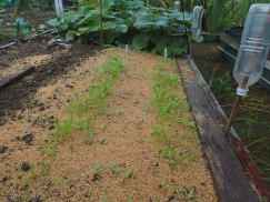 子葉展開後、密生しているところや生育の遅れの弱い株を間引いて株間を3〜5pにします。