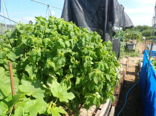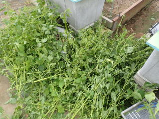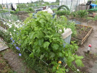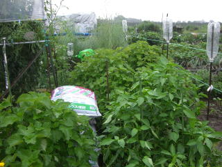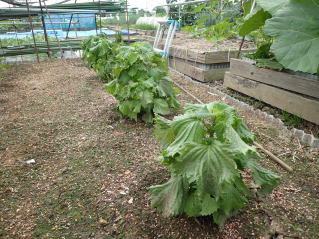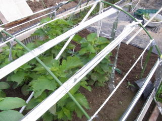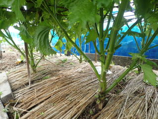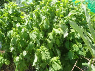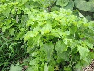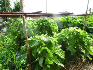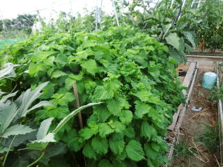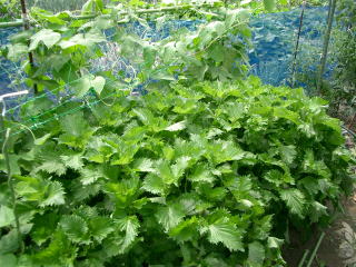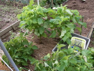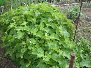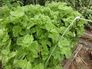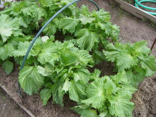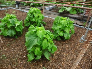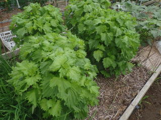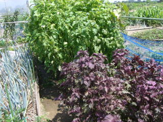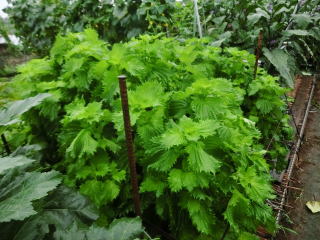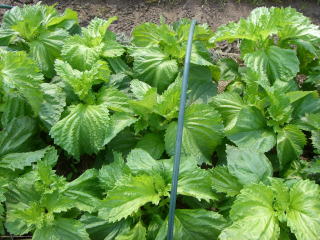 葉ジソ・穂ジソは、1m幅のベットに条間30pでスジまき、またはバラまきし、土をかけず板で叩くか、足で踏み固め、水をかけます。間引いて本葉4枚で、株間30pに2〜3本立ちにします。