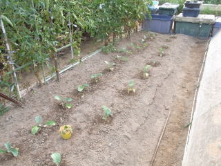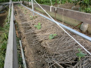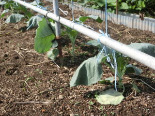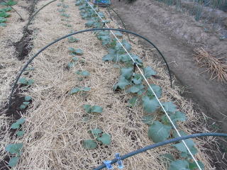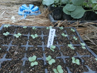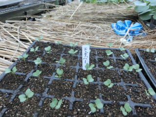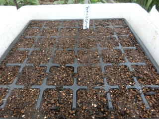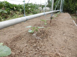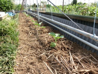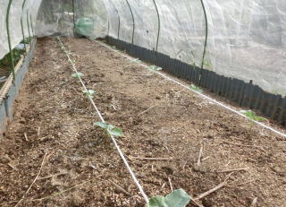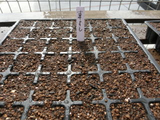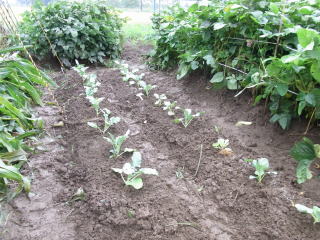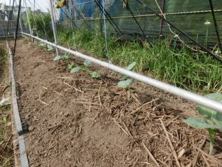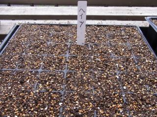128穴のセルトレーにまき、本葉1.5枚で1本にします。または育苗箱に12p間隔でスジまきし、本葉2枚で苗床に移植し、本葉4〜5枚で畝間65p、株間35pで植え付けます。