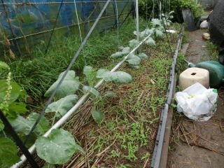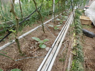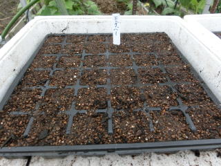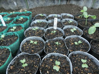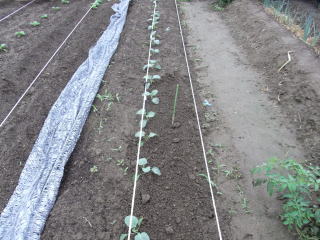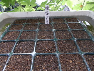 128穴のセルトレーにまき、本葉1.5枚で1本にします。または育苗箱に10cm間隔にすじまきし、本葉2枚で苗床に移植し、本葉4〜6枚で畝間65cm、株間40cmで植えつけます。