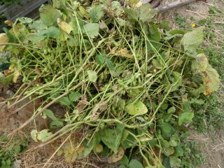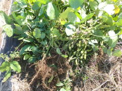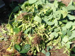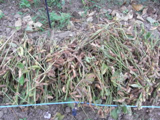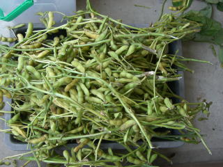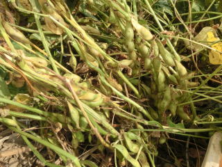 株の中央付近の莢が十分ふくらんだ頃、莢が黄化する前に株ごと引き抜くか、