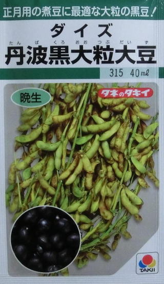 種皮にロウ質粉を被る大粒黒豆で、京都・兵庫の特産品。分枝数が多く、草丈は低めの晩生種。品質が良く正月用の煮豆に最適で、若どりすればエダマメとしても楽しめる。
