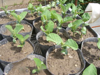 3号ポットに培養土を入れ、種を3粒ずつまきます。本葉が2枚のころ成長が遅れているものを間引いて2本立ちにします。植え付けの2週間くらい前までに石灰を施し、よく耕します。畝の中央に溝を掘り、元肥を入れて幅90p程の畝を立てます。