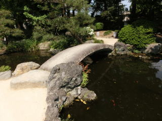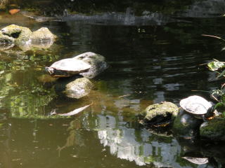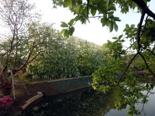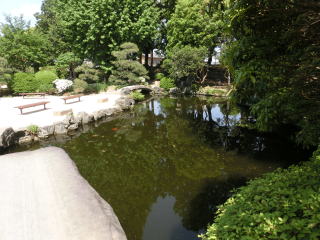 足利学校には、方丈の北と南にそれぞれ池の庭があります。この当時一般に行われていた書院庭園の形態をもつ築山泉水の庭です。この庭は、湧水をたたえた池の入り組んだ汀と巨大な立石、それにかぶさる松が特色です。三つの峰をもつ築山は比高が高く、池の水面から三メートルほどもあり、池に映えてよく調和しています。