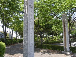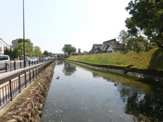 ここは、江戸時代に館林城の「八幡郭」があったところです。八幡郭は、本丸東にあって城沼に突き出した一郭で、武士の守護神である「八幡神」が祀られていたことからこう呼ばれました。