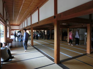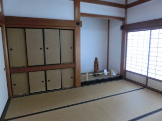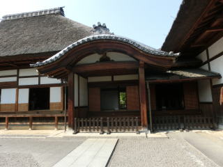 庫裡は竈(かまど)のある土間、板敷の台所、畳敷きの四部屋からなり、日常の生活空間でした。書院には、床・床柱、棚・違棚等が設けられ、庠主(学校長)の接客の場所などに用いられました。屋根は、方丈と庫裡が茅葺、書院が板葺、玄関が本瓦葺です。方丈の棟の高さは11.8mもあります。造りは質素ながらトガ(栂)普請で、当時木目や色合いが愛されたトガ材を長押(なげし)などに用いています。天井には美しいヒメコマツ(五葉松)の天井板を張っています。