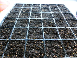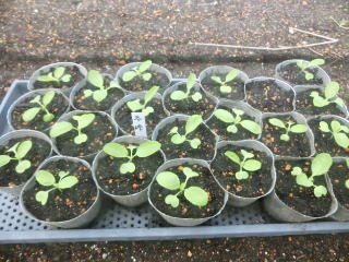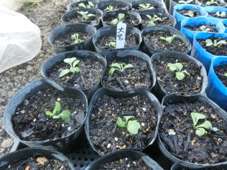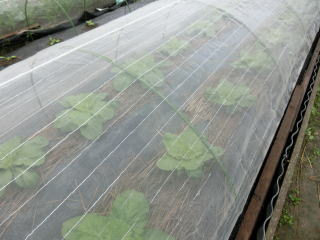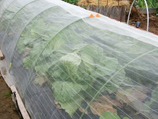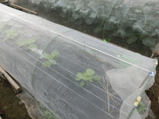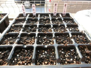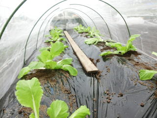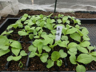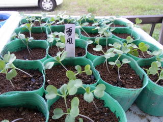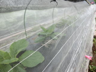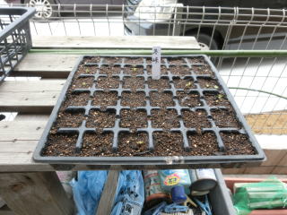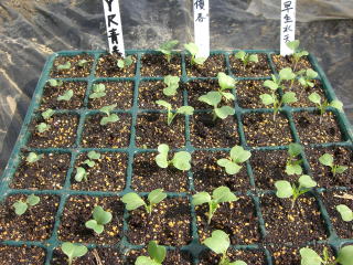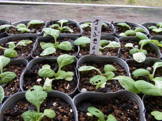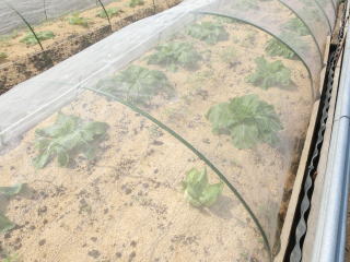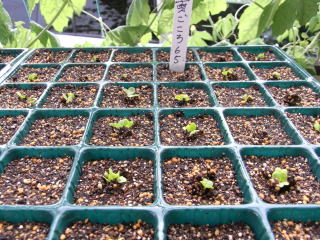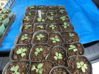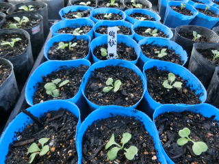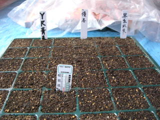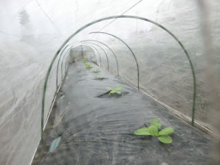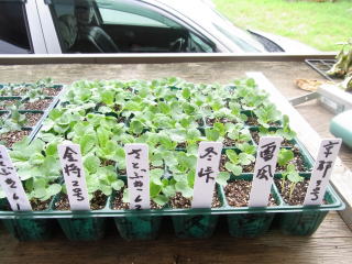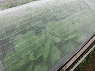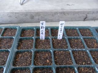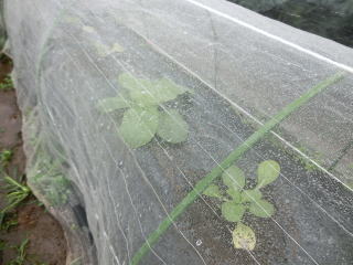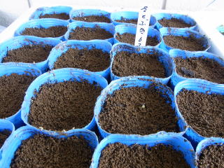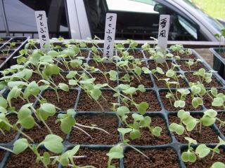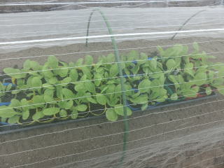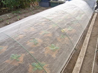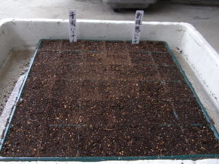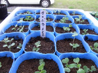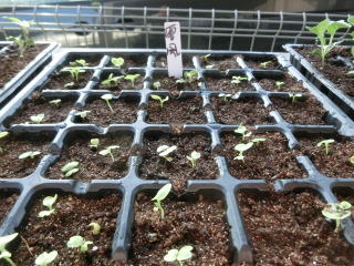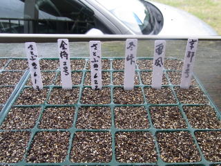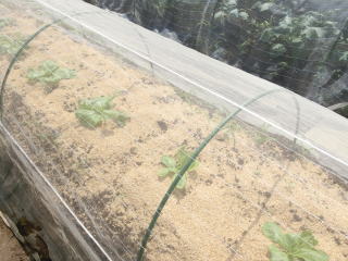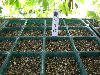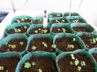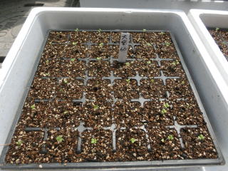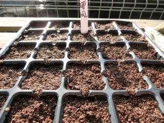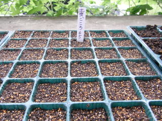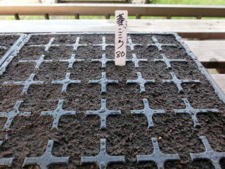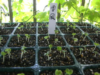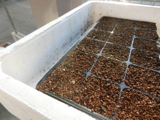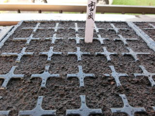 発芽適温は約25℃です。連結ポットに種をまき、うすく土をかけます。ポットは寒冷紗のトンネルで覆ってやると強い雨や害虫の予防に効果的です。