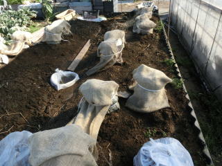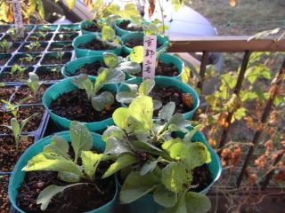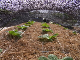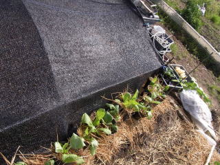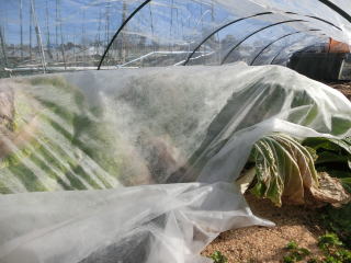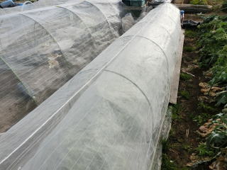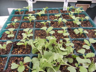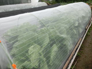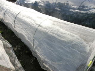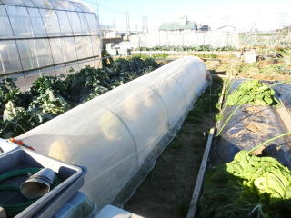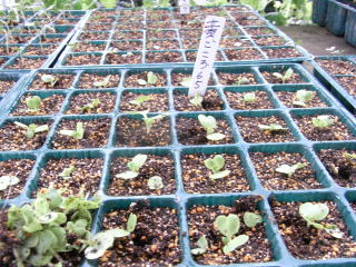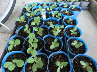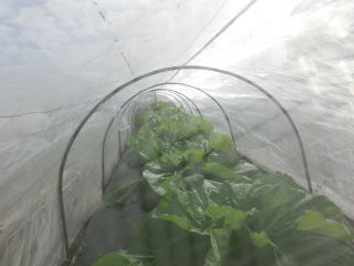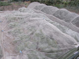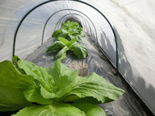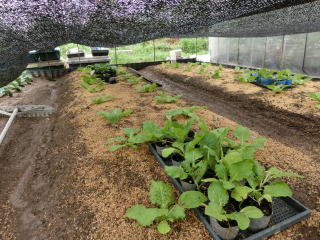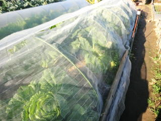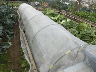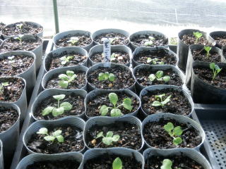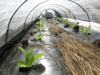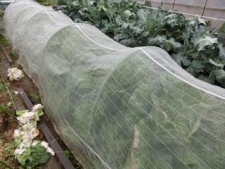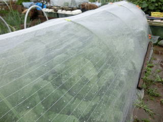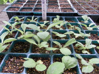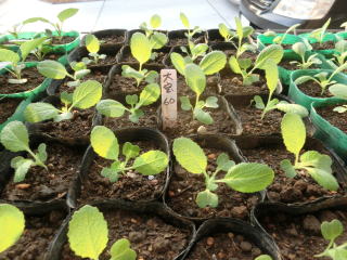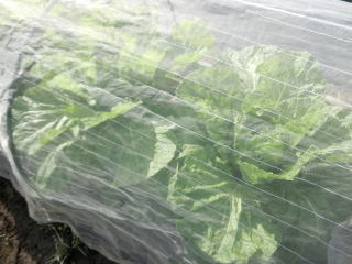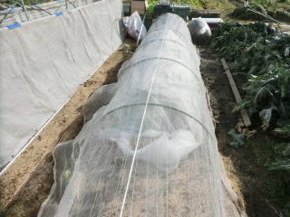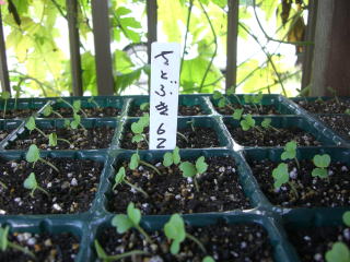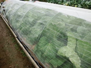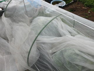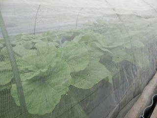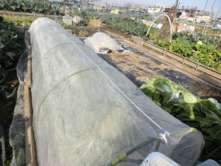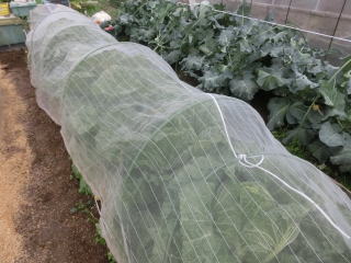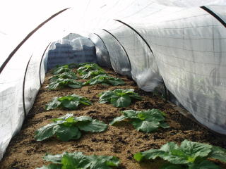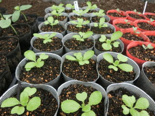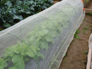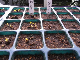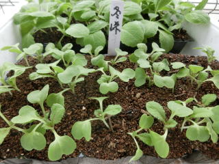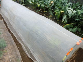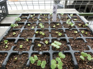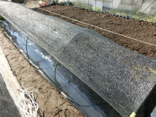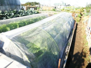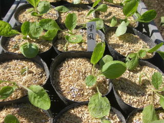 発芽適温は約25℃です。連結ポットに種をまき、うすく土をかけます。ポットは寒冷紗のトンネルで覆ってやると強い雨や害虫の予防に効果的です。