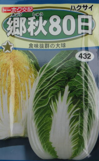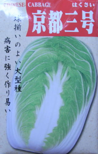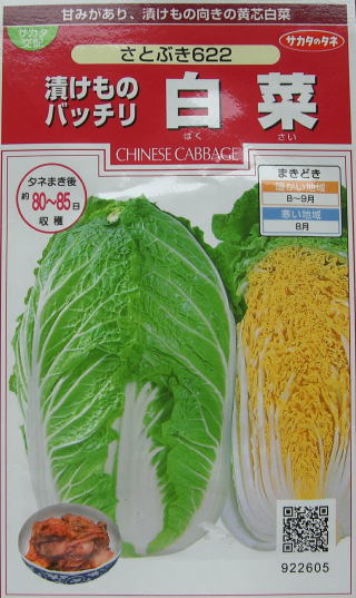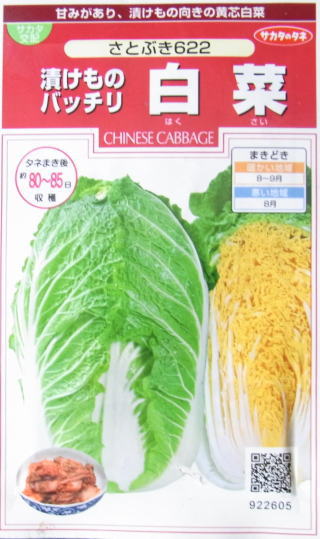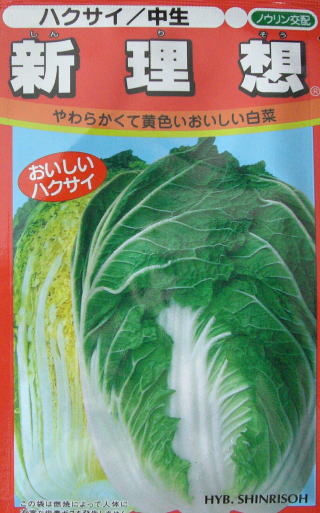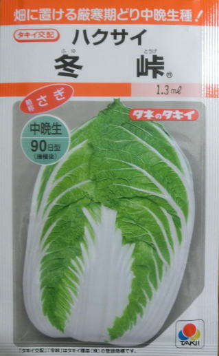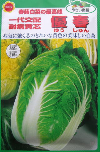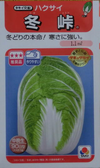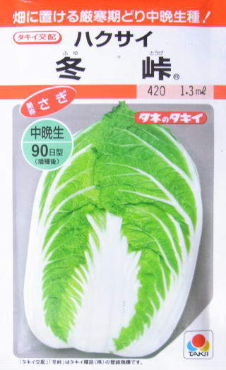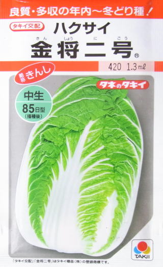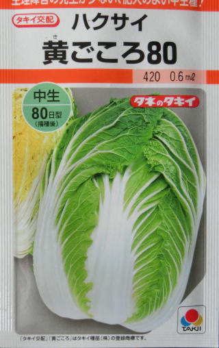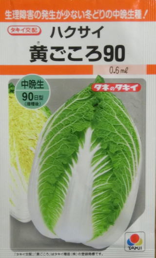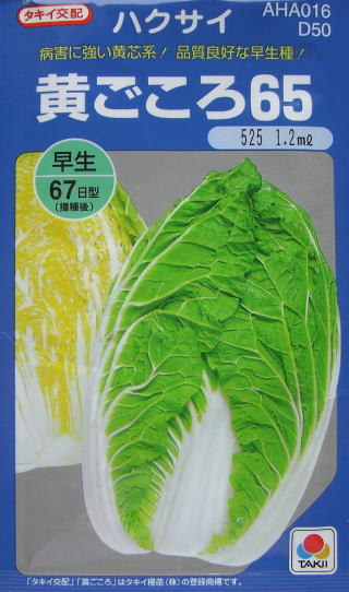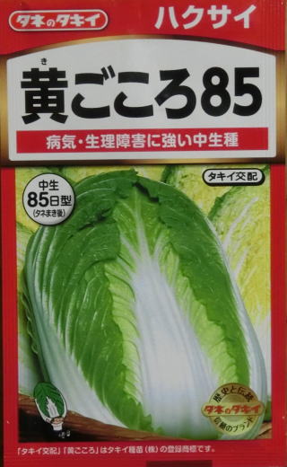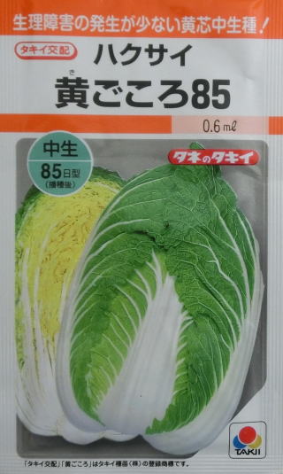 対病性強く生育旺盛な極早生種、晩抽型で春まきに最適の結球はくさいです。普通栽培で、まいてから60日〜65日で2kg〜2.5kgの中型円筒形で,上質の黄芯白菜ができます。1u当たり8株位の超密植栽培により1kg位のミニ白菜を作ることもできます。秋まき栽培でも良質のものができます。