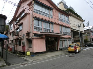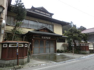 温泉旅館が隣り合う小さな温泉地で道路からすべて?の旅館が見える 左からたみや旅館、甚内旅館、湯どの庵