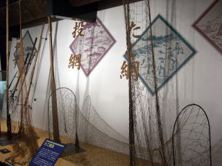各種サケ漁用具 左から ヤス 投網 たこ網 刺し網 地曳網
