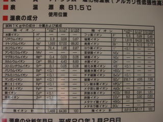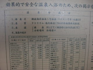 いわゆるナトリウムー塩化物泉の強食塩泉で約96%をそれらが占めている。館内説明書きにもそれらを大々的に謳っていて、高濃度=名湯らしき記述がある。気になったのは内風呂の記述に「この浴槽は源泉にその九倍の量の加水をしているが、それでも温泉基準の三倍の濃度があるので、良い浴槽です」とあった。
