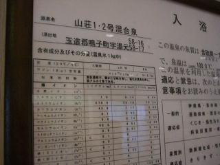 上にも書いてある通り、湧出量160ℓ、加温、加水、循環ろ過、塩素消毒。男女で1/2の80ℓで、源泉浴槽があるが、循環ろ過、加温、塩素消毒の感じがする。浴槽の成分分析書があるとどのような値になるのか興味のあるところです。成分の濃さを過剰に謳いすぎているきらいがあることが「気になる」。
