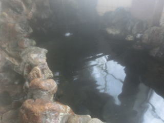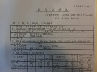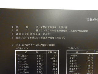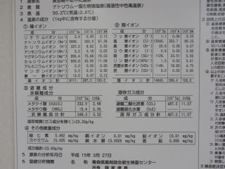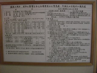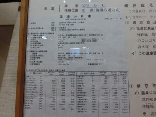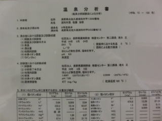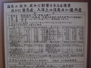 館内提示の分析書は二通あり、1号源泉、2号源泉と表示されているが、結果混合されているのか、浴槽別の供給なのかは聞いてみなかった。成分分析からすると1号が高張性、2号が低張性で、大きく違っている。湧出地は同じなので、掘削深さの違いだろうと思う。浴槽の配置などから想像すると、露天風呂の木浴槽と内風呂・露天岩風呂とに分けて供給されているようだ。帰ってから考えると、なめてみると簡単なことと気がついた次第でありんす。