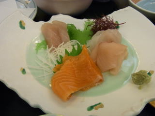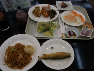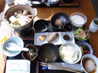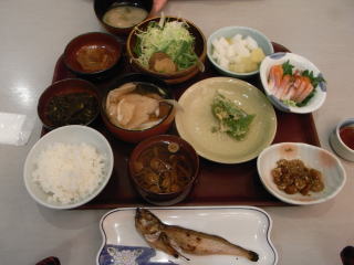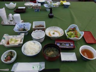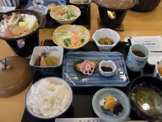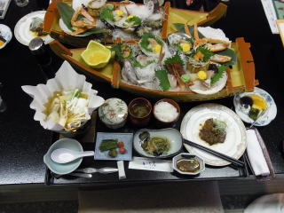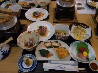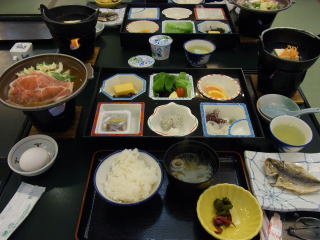 まず案内された部屋は15~18㎡位のツインのベットルーム、8畳のメインと4畳の次の間。ゆったりと過ごすことができて満足のいくものでした。食事も格安プランの割には上の写真にあるように量、質共に合格ラインを超えていた。