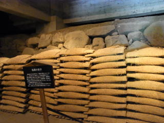 若松城の天守台内部には、「塩蔵」が設けられていました。海をもたない会津にとって塩は貴重品であり、越後方面から船で輸送された塩は、籠城時の備えとして蓄えられていました。戊辰戦争時、城中廊下に貯蔵された塩は約三万六千俵に達したとされ、その一部にこの塩蔵の塩も含まれていました。現在ここでは、戦争に備え塩の備蓄状況を見回りする蔵役人と積み上げられた塩叺の情景を再現しています。
