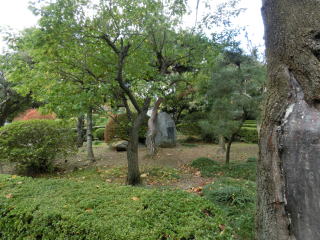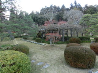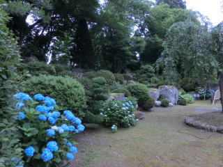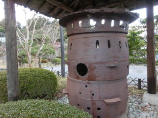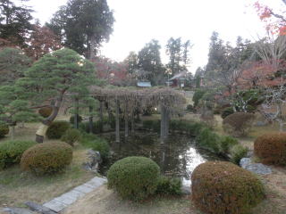 藩邸跡地は、現富岡高等学校を含む陣屋としては広大な敷地で、江戸藩邸や藩庁維持管理に出費を強いられたでしょう。建築年代は天保十四年(1843)再建と伝わっています。(前藩邸は火災により焼失)建物は昭和五十二年に藩邸移築補修、黒門(中門)改修とありますので、敷地内のどこかにあったのでしょう。現在の庭園は、古絵図などの資料によって整備されたと思われます。