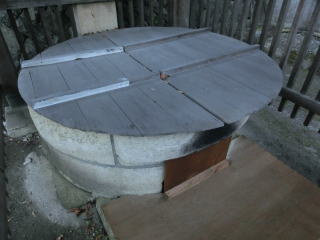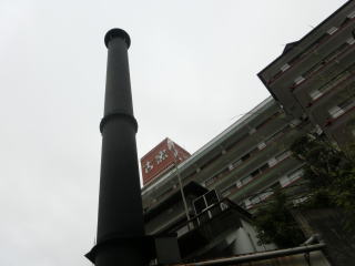 現在の煙突は昭和十四年に建設された鉄筋コンクリート製のものです。明治五年(1872)には高さ36mの鉄製の煙突が現在の位置より西に建てられました。4.4mのレンガ積みの基礎の上に、高さ1m、慮っ系1.3m程ある鉄製の筒を積み上げ、四方に鎖を張って支えていました。この初代の煙突は、寧寺十七年(1884)に防風によって倒壊しましたが、高い煙突が設けられていたのは、燃焼効率を高めるとともに石炭を燃やす際に発生する煤煙対策のためでした。明治時代に使用された鉄製の煙突基部は、現在は井戸の囲いとして残されています。