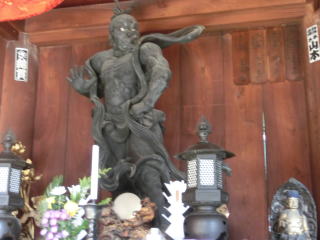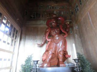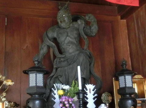 仁王さまは正式には「執金剛神」と呼ばれます。私どもがお唱えするお経「法華経」の「観世音菩薩普門品第二十五」というお経の中に「観世音菩薩は法華経の功徳によって佛に近づこうと願う人に執金剛神を現じてその人の行いを助ける」と説かれております。すなわち、仁王様の厳しいお顔やお姿で「法華経」を信仰する私たちをあらゆる魔から守るというお約束をされているのであります。