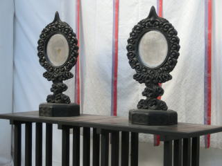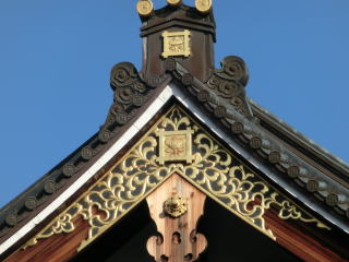 御尊像を安置する豪華な御宮殿厨子は東京信徒により、天蓋・幢幡等の善美を尽くした荘厳仏具は大坂・京都の信徒の丹精により寄進されました。須弥壇上の御宮殿厨子の左右には、聖人のご両親妙日尊儀・妙蓮尊尼と本弟子である六老僧の木像が列せられています。内陣正面の虹梁にある立正の勅額は、昭和六年(1931)宗祖第六百五十年遠忌の時、昭和天皇より日蓮聖人の御廟へ下賜せられたものです。