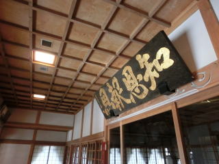 内外装は木造仕上げ、外陣の天井画「黒龍」は加山又造画伯の力作で、昭和六十一年度(1986)の建築業協会賞を受賞した総本山の根本殿堂にふさわしい規模と格調を備えました。