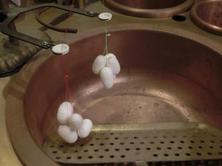 繰糸場は、繭から生糸をとる作業が行われた場所でした。創業当初はフランス式繰糸器三百釜が設置され、世界最大規模の工場でした。明治五年から操業停止の昭和六十二年まで百十五年にわたって一貫して生糸生産を行いました。現在、建物内部には昭和四十年以降に設置された自動繰糸機が残されています。