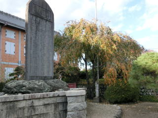 富岡製糸場創業翌年の明治六年(1873)六月、明治天皇の要請により皇太后・皇后御一行が富岡製糸場を行啓されました。それから七十年後に建立された記念碑がこの行啓記念碑です。台石は当時工女が皇后から賜ったといわれている扇をかたどっており、台石の上に置かれている台座の石はこの地方特産の三波石が使われています。