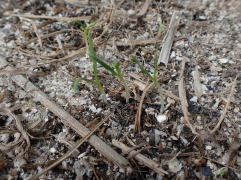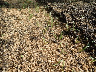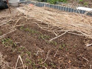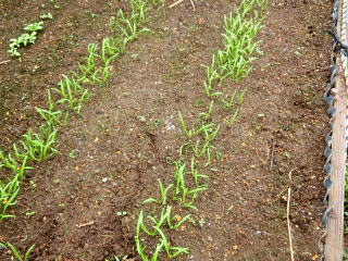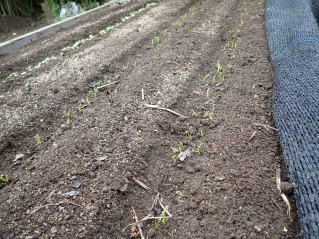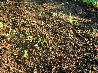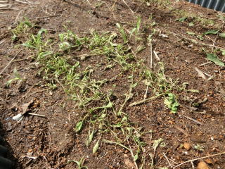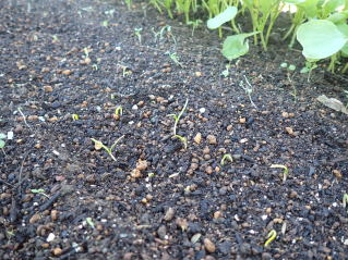 子葉展開後、密生しているところや生育の遅れの弱い株を間引いて株間を3〜5pにします。