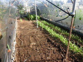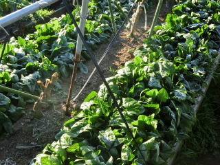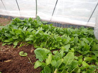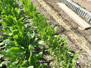 条間15〜20pで条まきします。ホウレンソウは特に水分を吸収しにくいため、発芽するまで種が吸水できるよう潅水を行い、乾燥に注意します。晩秋〜早春の低温期の栽培はトンネル・ハウスなどで保温して発芽を促します。