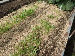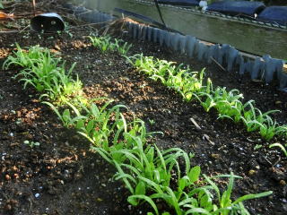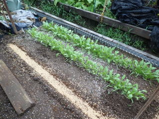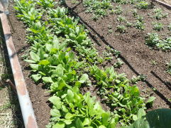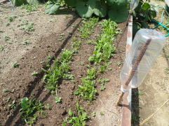 子葉展開後は密生しているところや生育の遅れている弱い株を間引いて、株間を3〜4pにします。草丈が25p程度になったら、順次収穫します。