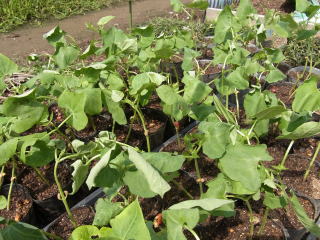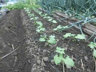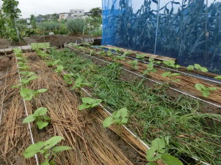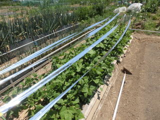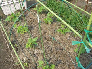 うね幅1m位、株間50p位に1ヶ所3〜4粒点播きします。つるなし種ですから支柱を立てる必要はありませんが、敷きわら、マルチなどを行うとよいでしょう。