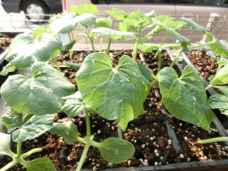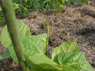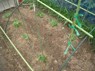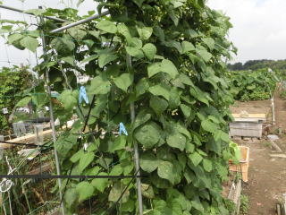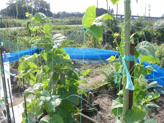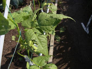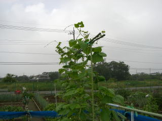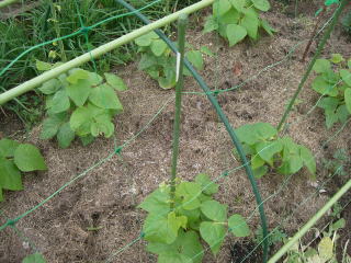 本葉5〜6枚の頃1.5m位の支柱を立てて、からませます。