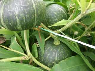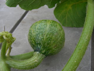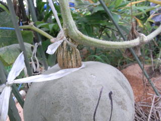 収穫は1株当たり4果に抑え、それ以上着果させてもうどんこ病等を発病して草勢が衰え極小玉で終わります。必要以上に収穫を伸ばすと強日光、高温により外皮部が変色、腐敗、発酵し保存性が極端に悪くなるので注意する。
