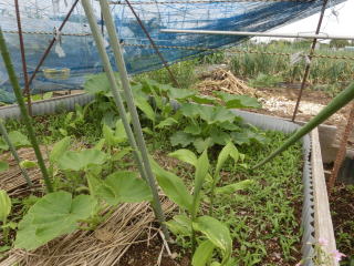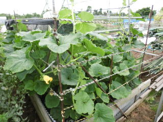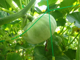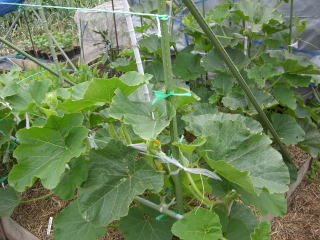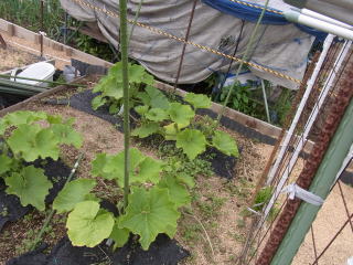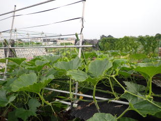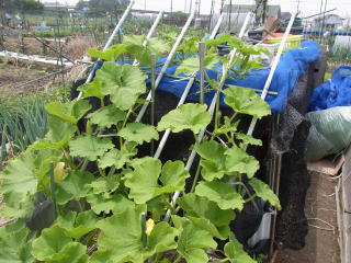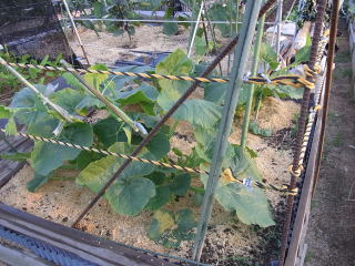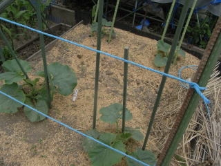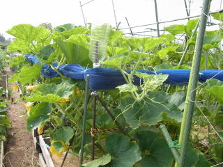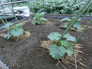 1u当り苦土石灰100g、完熟堆肥3s、有機配合肥料100gを施してよく耕します。つるの間隔が35pになるように配置します。果実は10節以降に着果させます。18節までの脇芽は取り除きます。