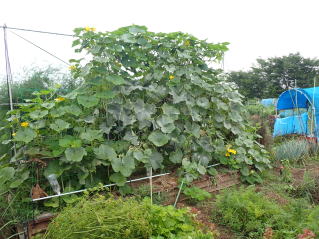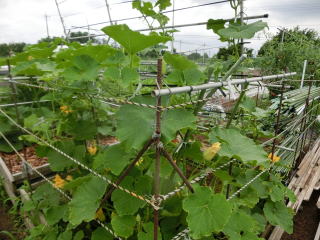 育苗は4号ポットに2粒まきして本葉1枚の頃に、直播では3〜5粒播きし、本葉3枚までに1株にします。3m幅のうねにつるを3〜4本仕立てて1m間隔に植えつけます。