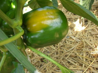 ピーマンが未熟果を収穫するのに対してカラーピーマンは完熟し黄色、橙色、赤色になった時収穫します。大きさも普通ピーマンと比較すると約3倍の重量にもなりますので、茎が折れやすく早めの整枝を行い、また茎の末端に近い果実は熟期が長くなるので摘果し茎の負担を軽くしてやります。