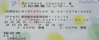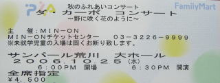 サンパール荒川入場と同時に ん? 今までのコンサート会場と雰囲気が違った。すぐにコンサートスタッフの所為だと気が付く。観客とスタッフが握手したり肩をたたいたりお辞儀をしたり、普段の日常生活では当たり前の行為が、今までのコンサート会場には無かったので、違和感。で、入場時に頂いたコンサート案内に、主催MINーON と書かれていた。 会場内に入ると、男性2対女性10人の割合、みんな身内の気安さからか、立ったまま遠くの人と大声で話していた。