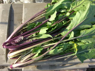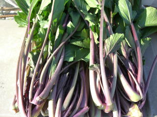 ハクサイなどと同じアブラナ科のツケナの仲間で、主に花の付いた(苔)を食用にします。名の様に葉柄やとうは紫紅色をしていますが、熱を加えると濃い緑色になります。甘味と特有の風味があり、手軽に作れます。