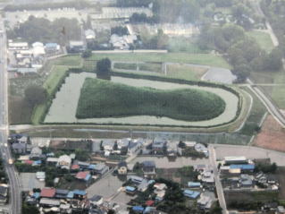 南側から古墳に至る道は、天正十八年(1590)に石田三成指揮約八千の軍勢が忍城攻略戦に於いて、忍城水攻め作戦の堤防を築いた跡とで、石田堤といわれているものです。ここ丸墓山古墳はその際石田三成軍が本陣を置いたと伝わります。