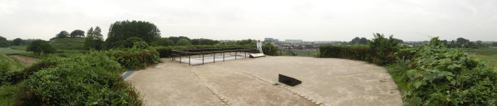 かっての「武蔵国」(埼玉県、東京都、神奈川の川崎・横浜の大部分)で最大の古墳です。周囲には長方形の堀が中堤を挟んで二重に巡り、墳丘くびれ部と中堤には造出しと呼ばれる張り出しがあります。現在は遊歩道になっている高まりが中堤にあたります。