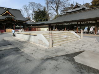 本殿保存修理にあたり、創建当時に復原するために後から設置した石段や敷石・縁石などは取り除かれました。その取り除かれた石材を再利用してこの石段を設置いたしました。平素は危険防止の観点から上に登らないでください。集合写真を撮るときのみ許可をとって石段の部分のみを使うことができます。