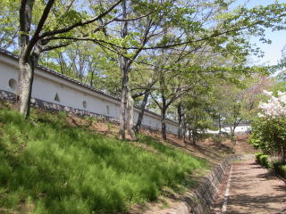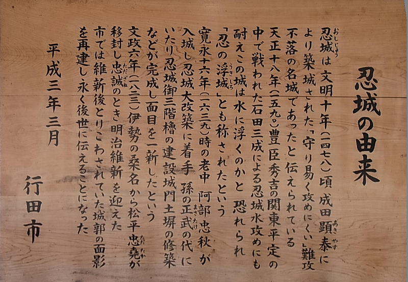 この一段高い桜並木は、天正十八年(1590)に豊臣秀吉の命を受けた石田三成が、忍城を水攻めにした際の堤の一部です。長さ二十八キロメートル(一説には十四キロメートル)に及ぶ堤をわずか五日間で築き、利根川と荒川の水を流入させたと云われています。三成の陣は丸墓山古墳の頂上に張られました。
