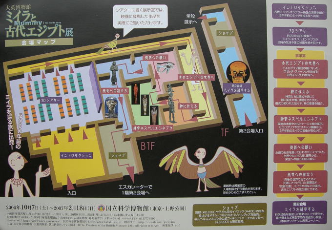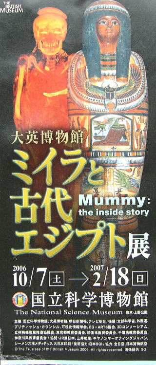 東京文化会館に隣接する国立科学博物館に寄った。折りよく大英博物館ミイラと古代エジプト展が開催されていたので、チケットを手に特設会場に入った。特別興味のある表題ではなかったが、これも何かの縁。立体映画は久しぶりの体験。ロゼッタ・ストーンの複製も有り社会科の1ページがよみがえる。この古代エジプト展を観ながらふと考える 大英博物館なの?フランスをもまきこんだエジプト文字の解読にしても、「文化遺産はわれわれにしか守れない」人種の驕りが聞こえる気がする。異郷の地に連れて来られたミイラ(魂)が、結果守られたなら、魂の悠久の地に帰りたかろうにと、思わずにはいられない。で、当初の予定の常設展示場に。60年足らず前の記憶をよみがえしながら(14歳の頃見学したことがある)又その後の年月による、確認と新たな事象を吸収するも、記憶として成立しないもどかしさ。自然科学が好きだったのにと、思いつつ時間がなかったことを理由に、雨の中退館した。本当に時間がなかったのですョ