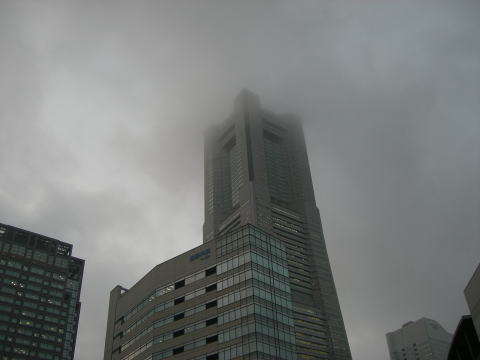 コンサート会場近くの横浜ランドマークタワー最上階霧に隠れる。