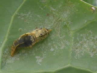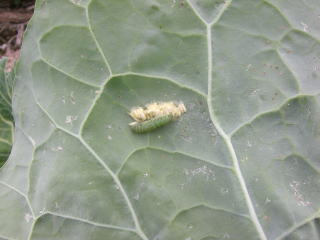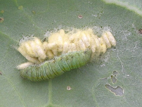 寄生されたアオムシ幼虫と寄生したコマユバチ(益虫)の繭