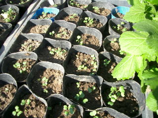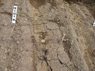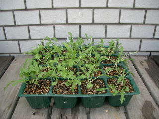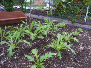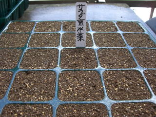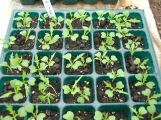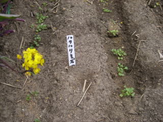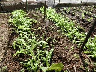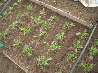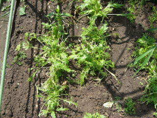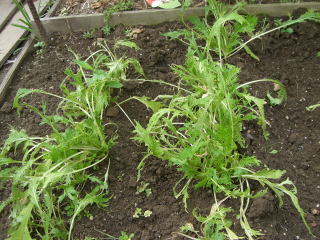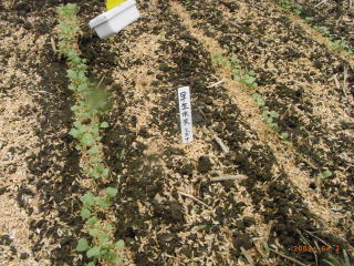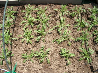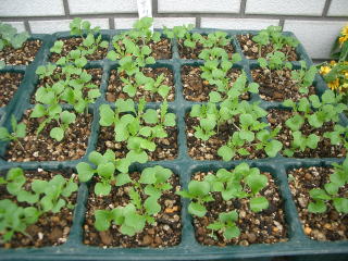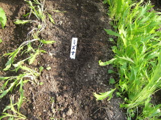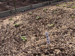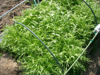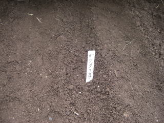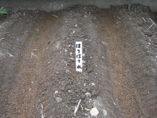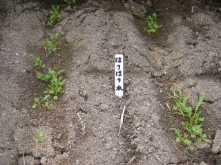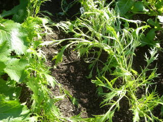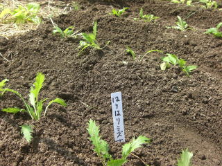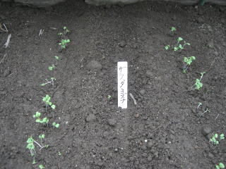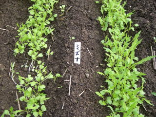 1m幅の畝に条間15pですじまきし、またはバラまきし、発芽したら混んだところを間引き、本葉2〜3枚で株間10pになるようにします。