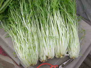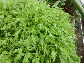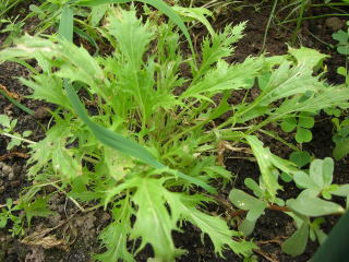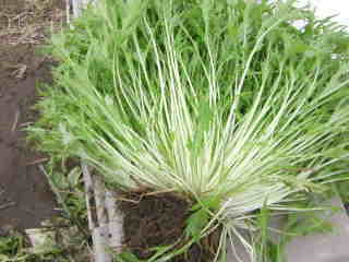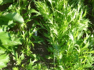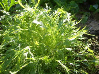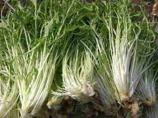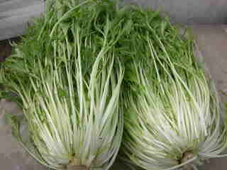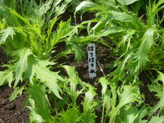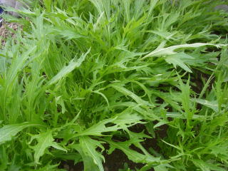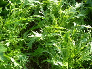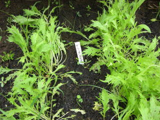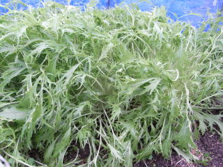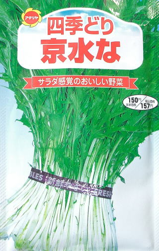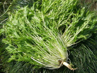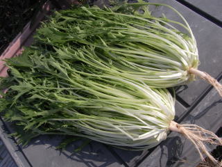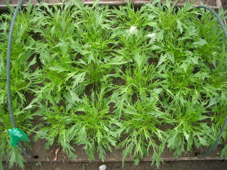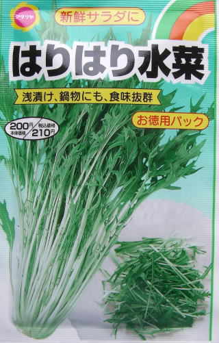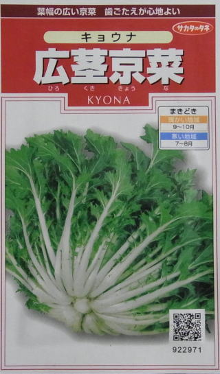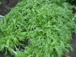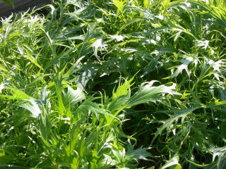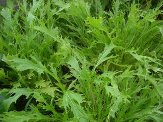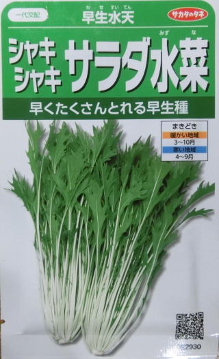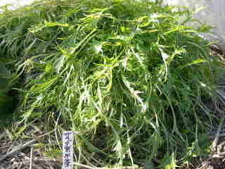 鮮緑色の細葉では葉縁に多数の切れ込みがあります。茎は細めで白く密生し株張りが非常によい。生育旺盛でまいてから30日くらいから収穫できます。特有の香りと歯ざわりが良く浅漬けに最適。生食のサラダに利用してさわやかな味覚です。