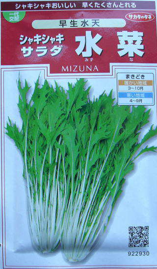 生長が早くてそろいもよく、作りやすいミズナです。低温期でもよく生長します。栄養分も豊富で、シャキシャクした食感がおいしいので、サラダや鍋物など幅広い料理に利用できます。