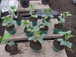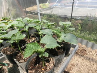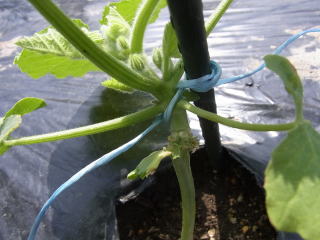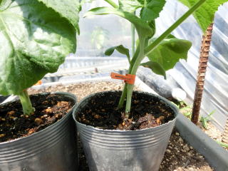 9pポットに3粒播きし、子葉が完全に展開したころに1本立ちにします。本葉3枚程度の若苗を定植します。親ヅル1本仕立てとし、25節で摘心。下位7節までの側枝と雌花は早めに除去し、7節以上の側枝は2葉で摘心します。