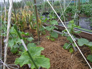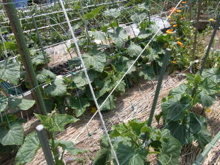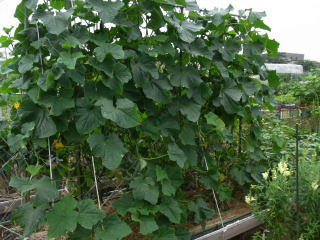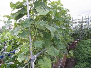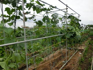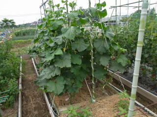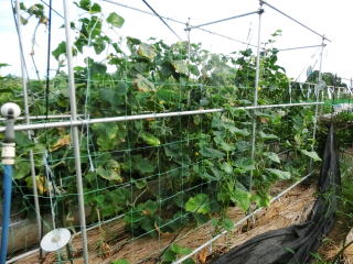 栽培は若苗定植か直まきがよく、元肥は多めに施し、灌水も不足しないようにします。植付本数は3.3u当り、5〜6株、側枝は下位3〜4節は早めに元から除去し、以降は長さ25〜30pで摘心します。伸びにくい枝や孫づるは半ば放任し、伸びたもののみ摘心します。